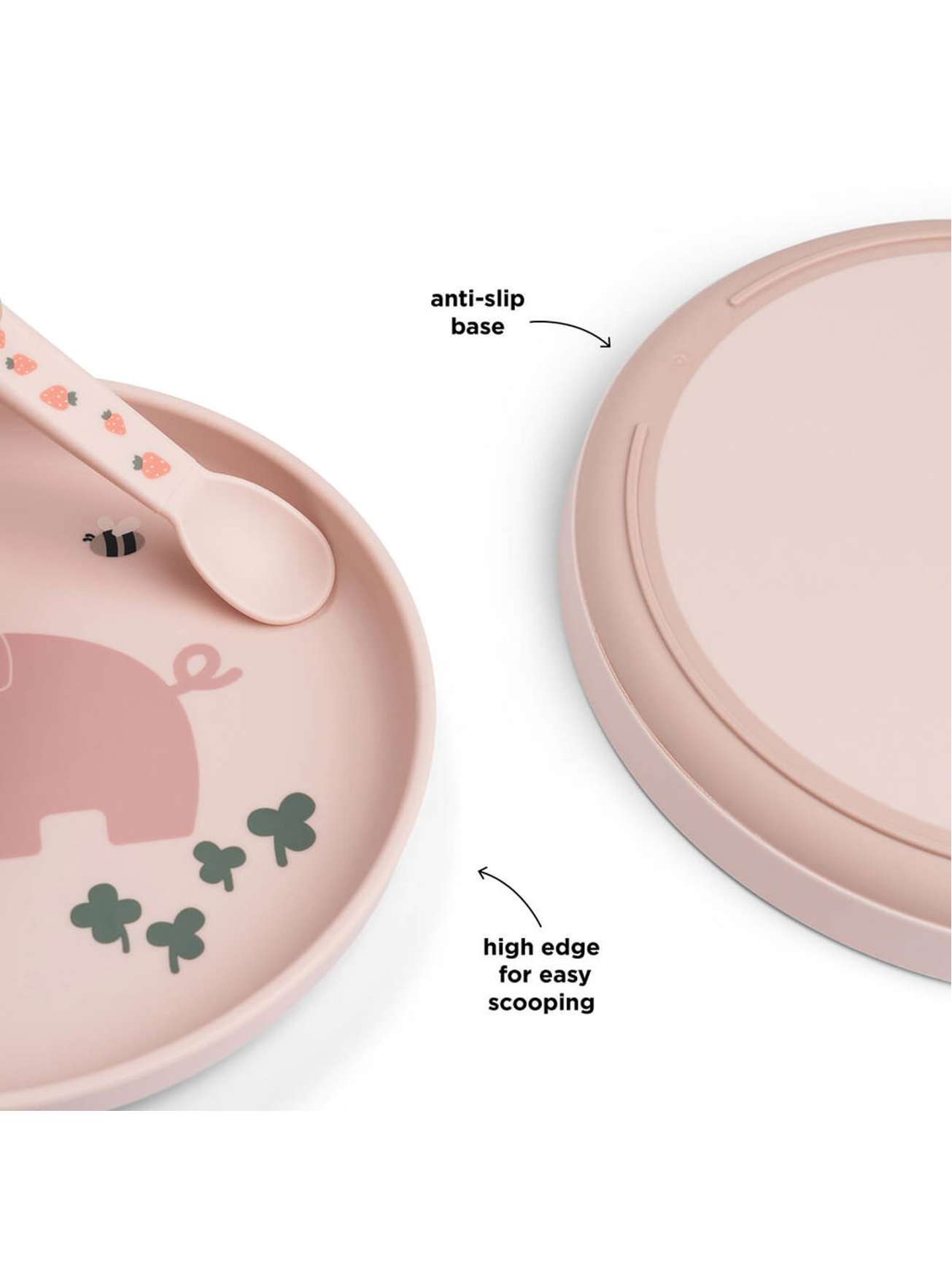 En praktisk sklisikker bunn sørger for at tallerkenen holder seg på plass under måltidet.