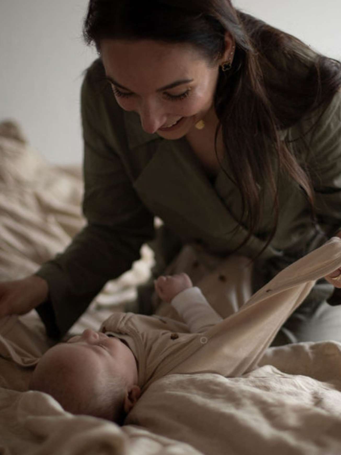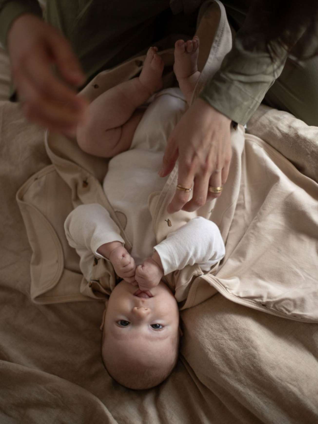 Svøpeposen er laget av myk, Oeko-Tex-sertifisert bomull med en liten andel spandex for fleksibilitet og komfort.