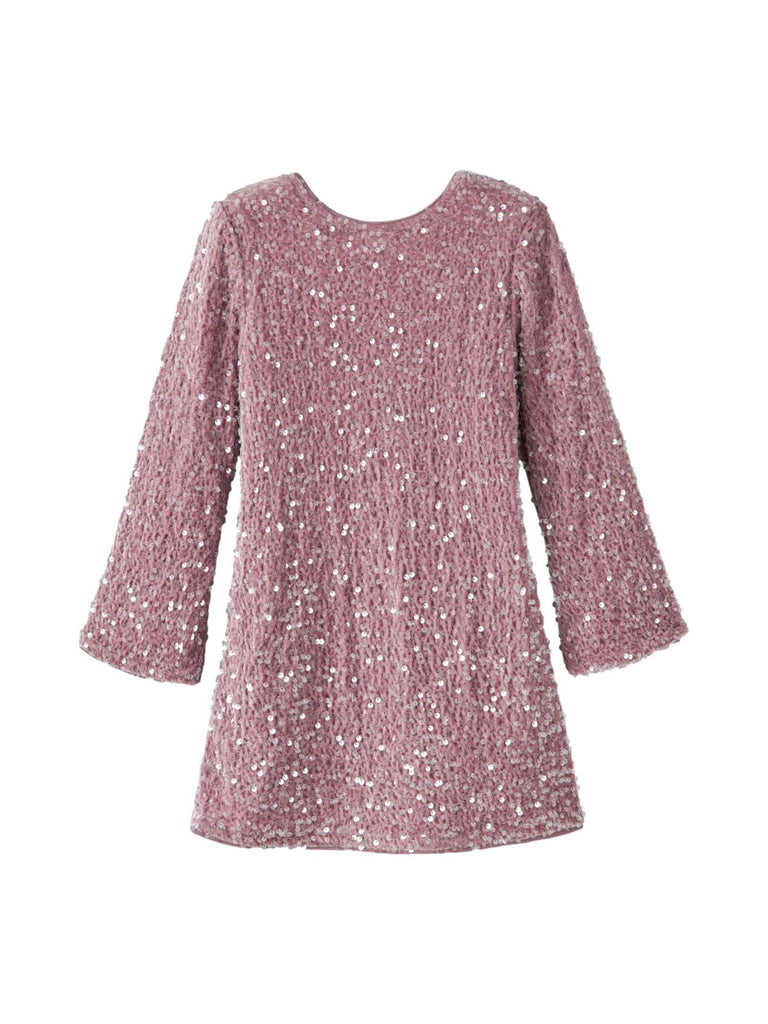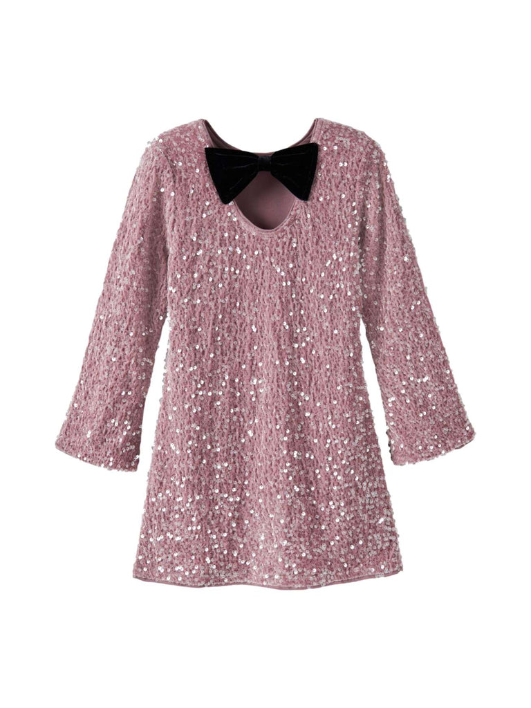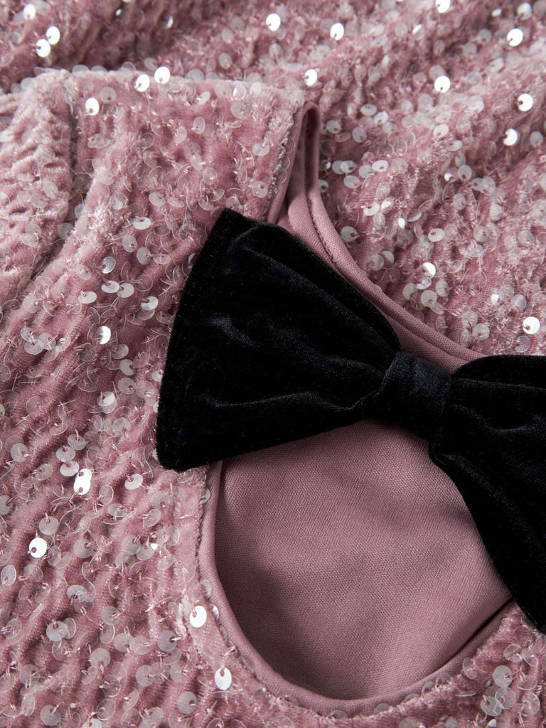 - Produkttype: Kjole - Hals: Rund hals - Ermer: Lange ermer - Lengde/størrelse: Kort - Fôr: Polyesterfôr for en ugjennomsiktig look - Ekstra detaljer: Sløyfedetalj - Ekstra detaljer: Paljetter - Passform: Normal passform
