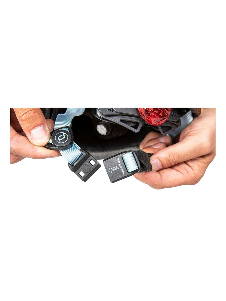 Det innovative magnetiske festet gjør det enkelt for barn å åpne og lukke hjelmen og forhindrer at huden klemmes.