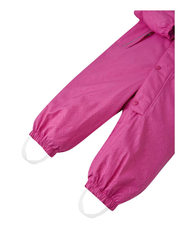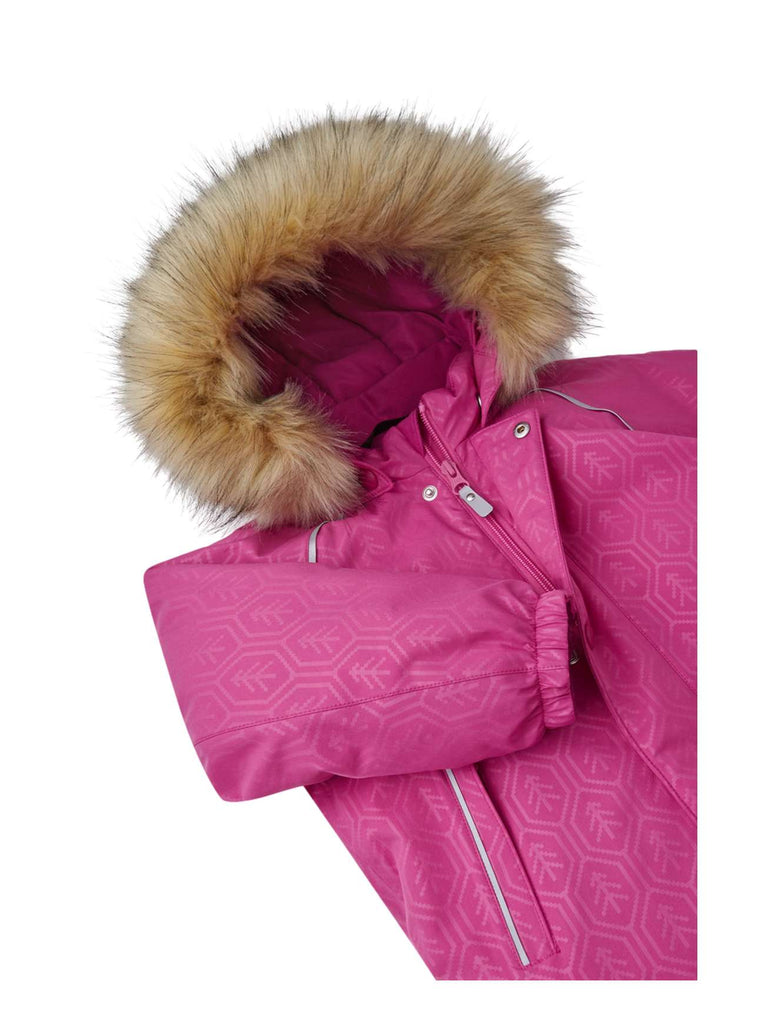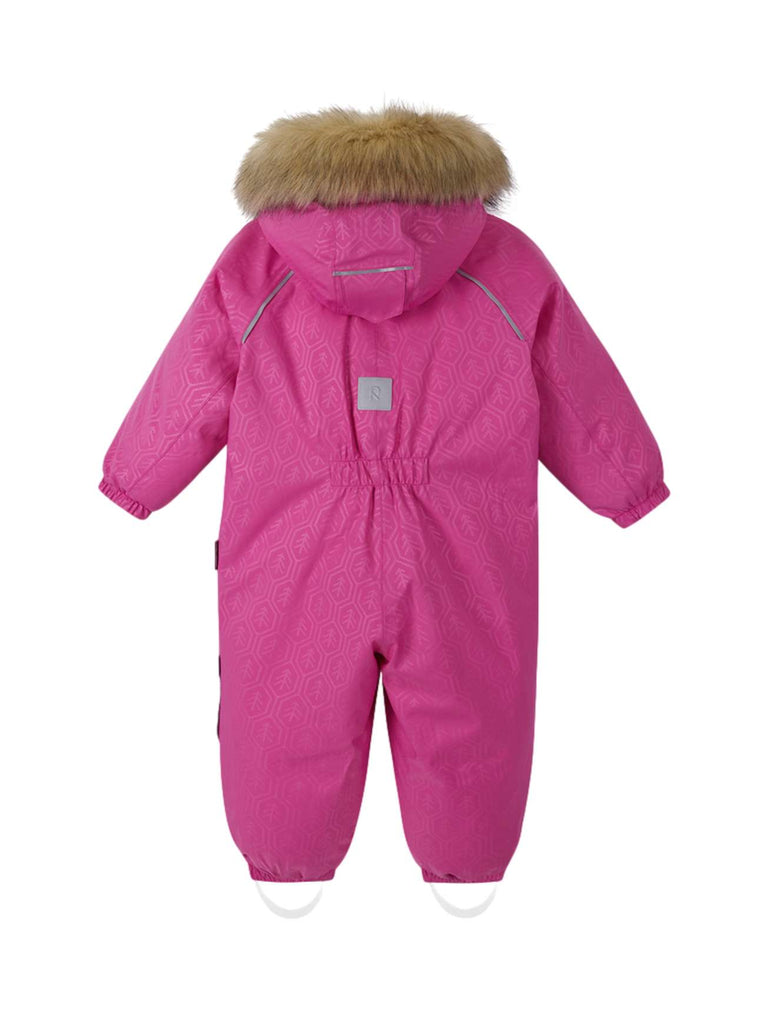 Reimatec vinterdress med smarte funksjoner. Alle sømmene forseglet vanntette, og overflaten er vann- og smussavvisende. Det glatte fôret letter påkledningen, og den avtakbare hetten er trygg, siden den løsner raskt dersom den hekter seg fast i noe. Mellomfôret består av 60 % dun og 40 % fjær, og setepartiet har dessuten vattert polstring for ekstra varme. Små glidelåslommer holder små skatter trygge. Solide fotstrikker i silikon sørger for at buksebena holder seg på plass og beskytter små ankler mot fukt og kulde. Vinterdressen tåler tørketrommel og er et godt valg både til å krabbe i snøen eller til turer i byen.