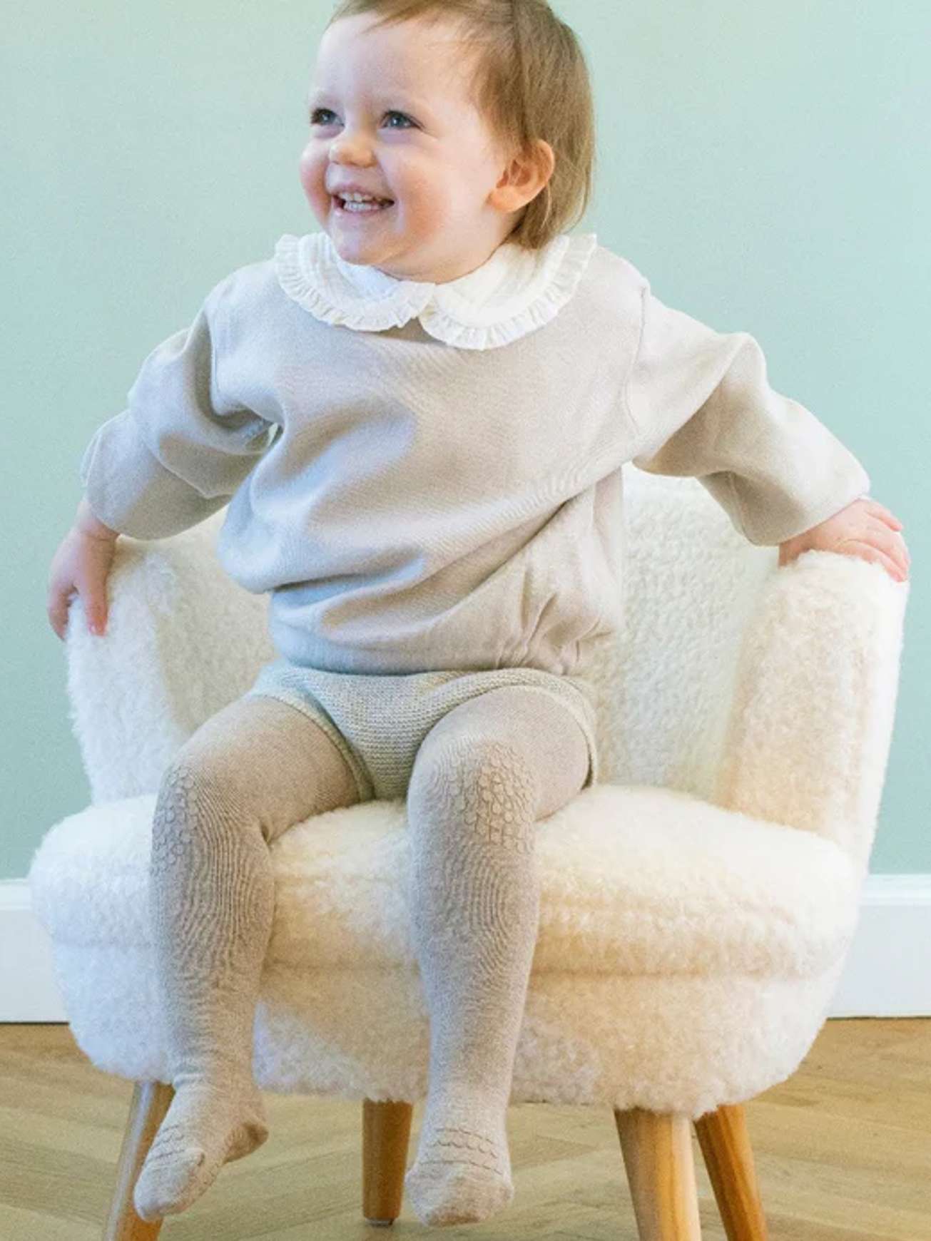 GoBabyGo krypetights i merinoull har spesialdesignede sklisikre gummiputer på knærne, under føttene og på tærne, slik at barnet ikke sklir når det begynner å krype og gå.