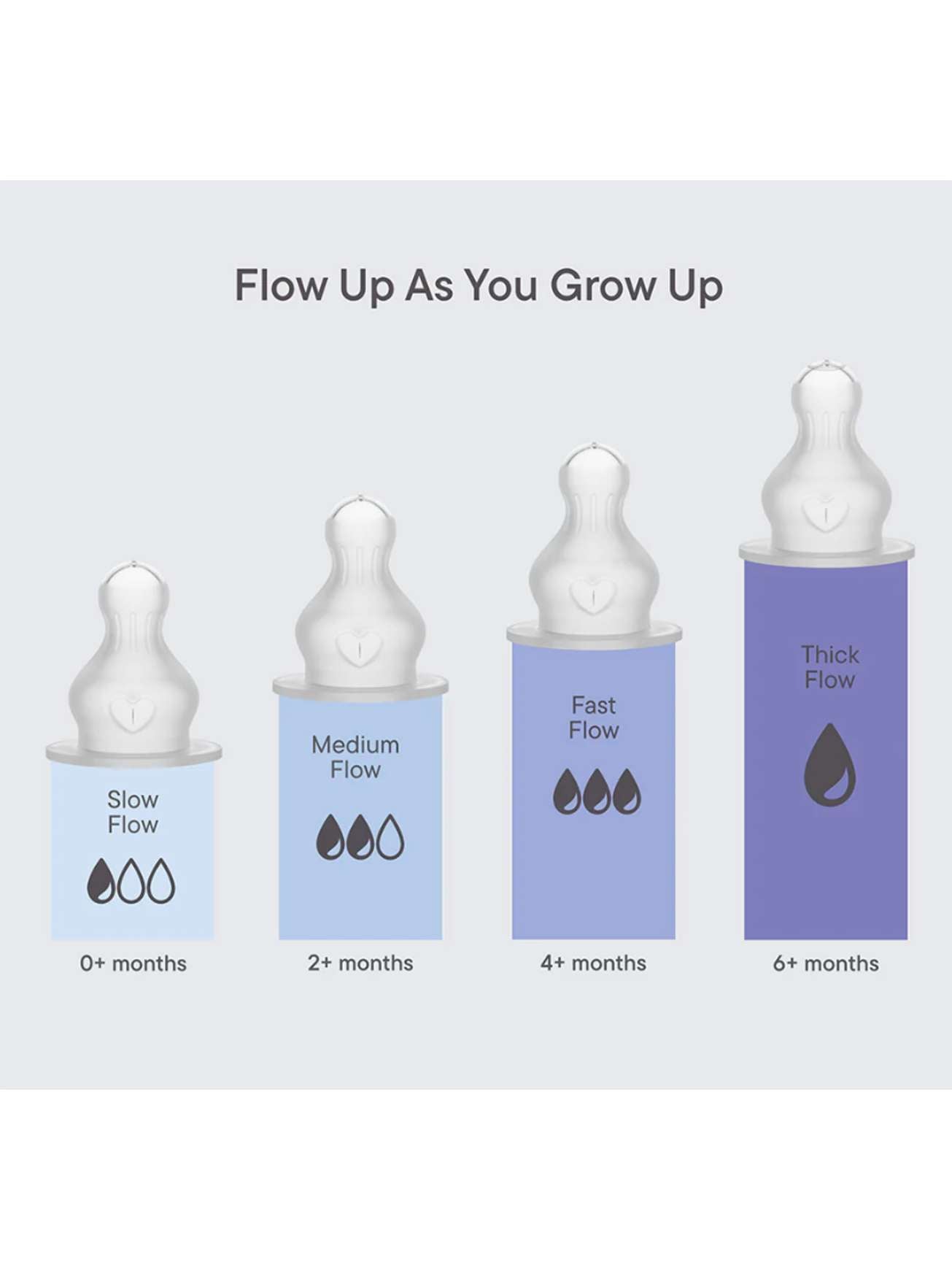 • Tilgjengelig med langsom, middels og rask strømningshastighet for å finne den mest komfortable rytmen for babyens skiftende matetempo.