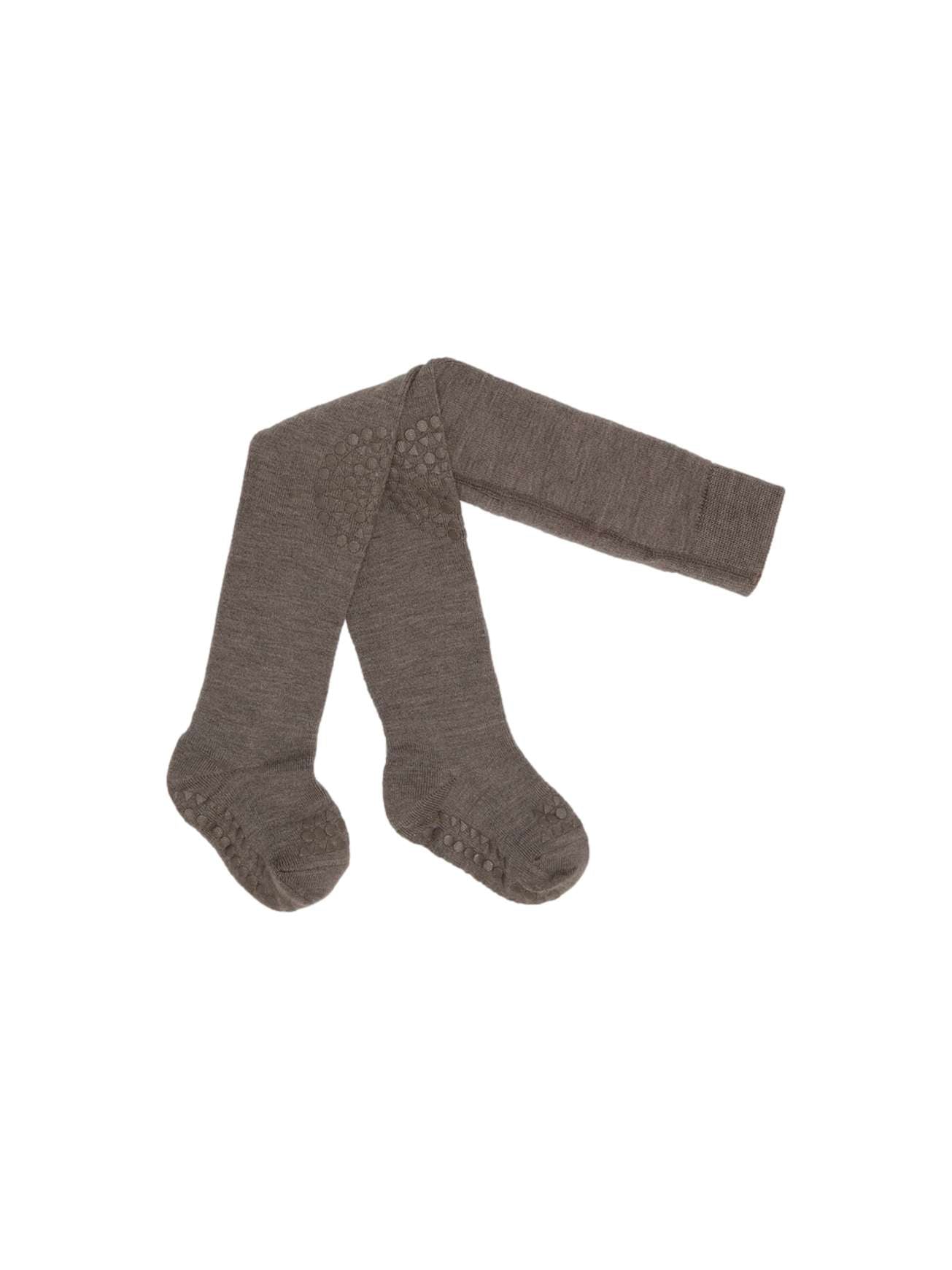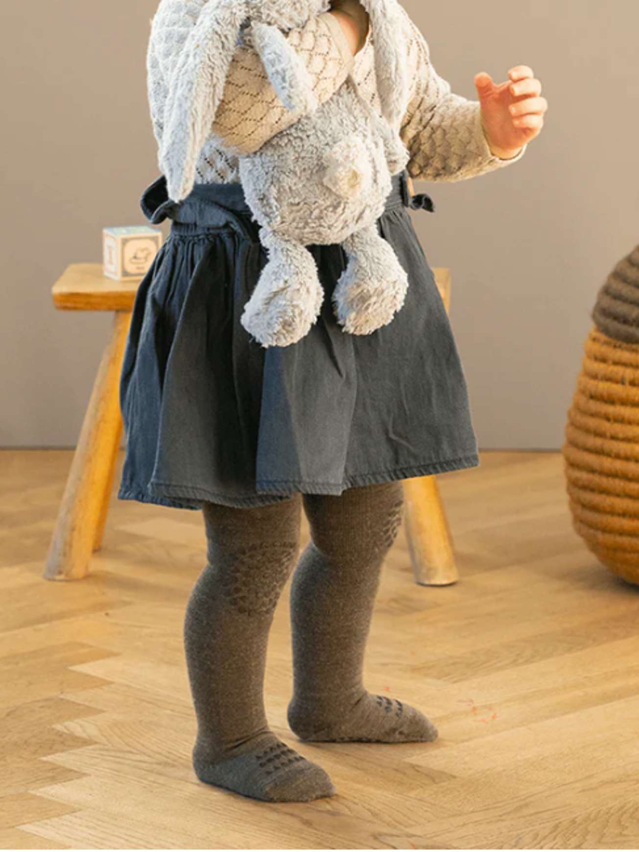 GoBabyGo krypetights i merinoull har spesialdesignede sklisikre gummiputer på knærne, under føttene og på tærne, slik at barnet ikke sklir når det begynner å krype og gå.