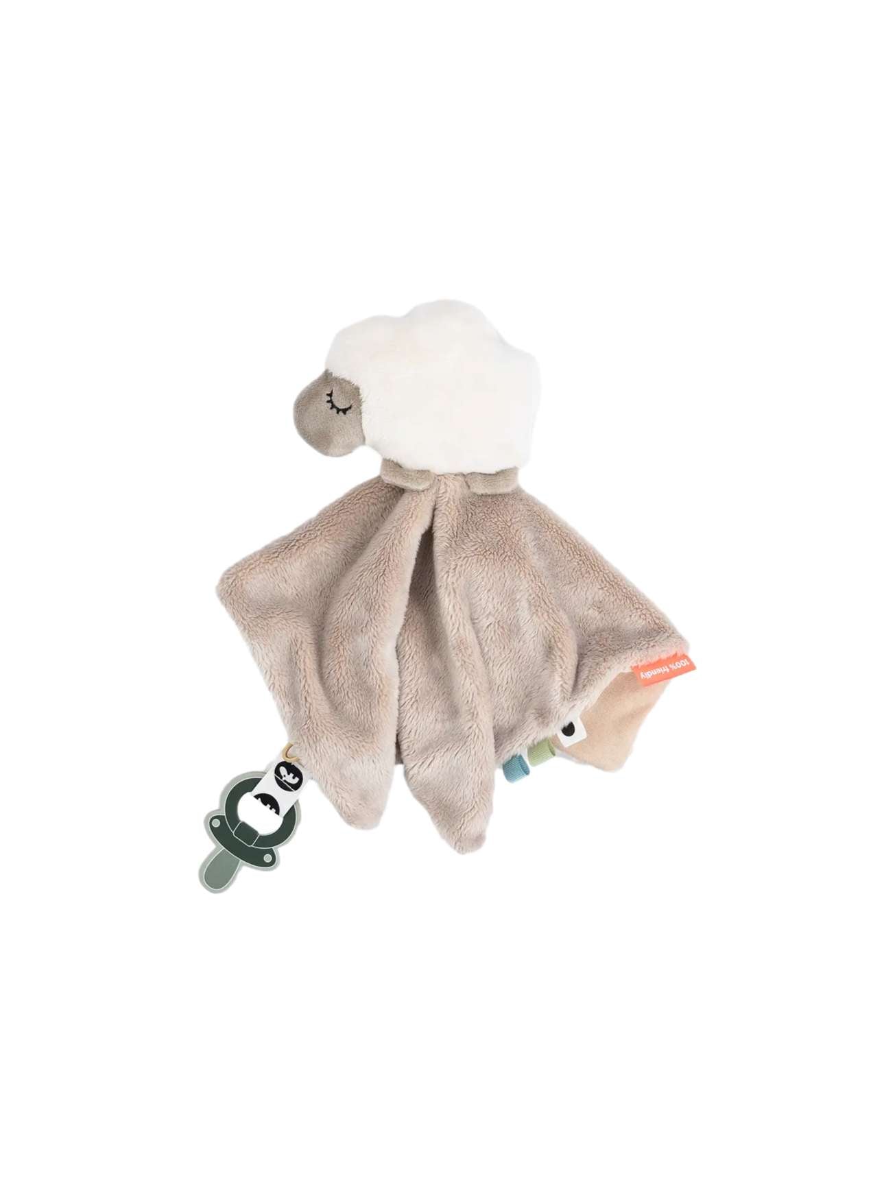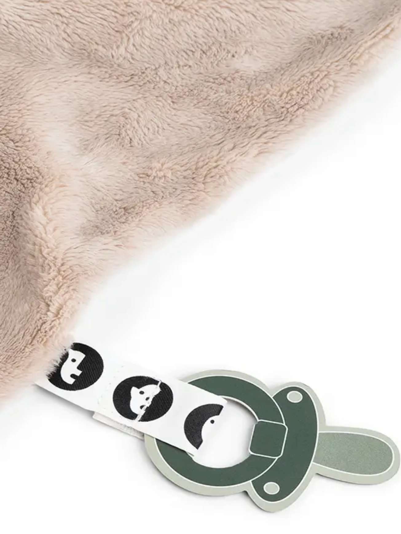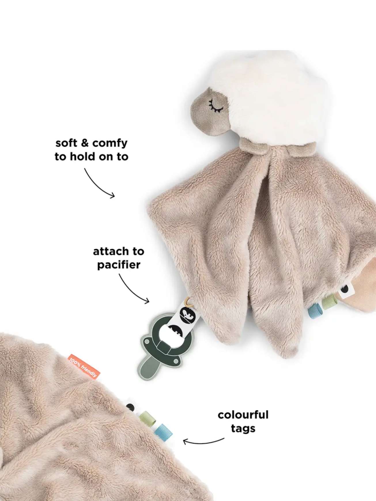 Kosekluten er fylt med morsomme merker og spennende teksturer klare til å bli utforsket. Den praktiske borrelåsremmen gjør det enkelt å feste smokken.