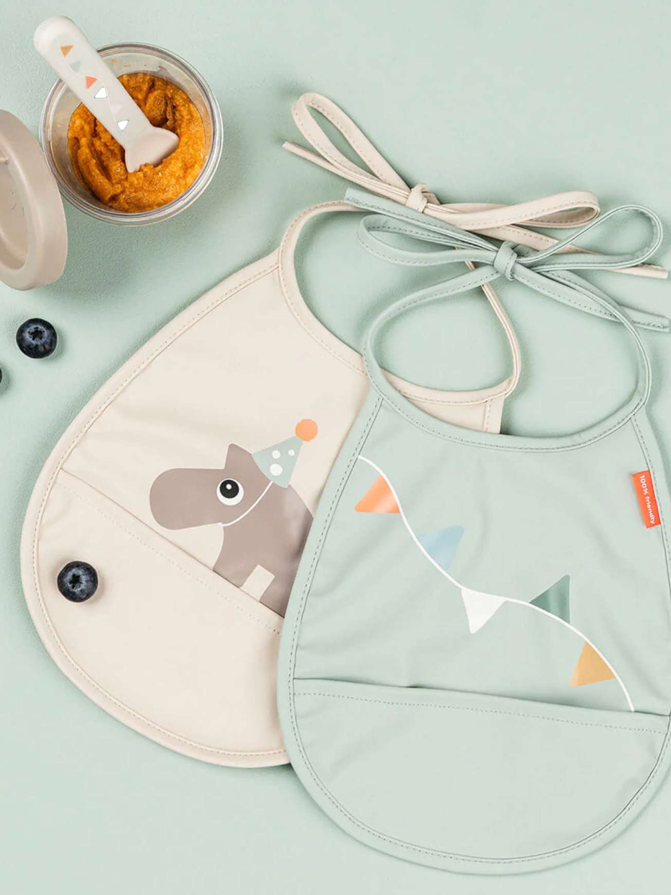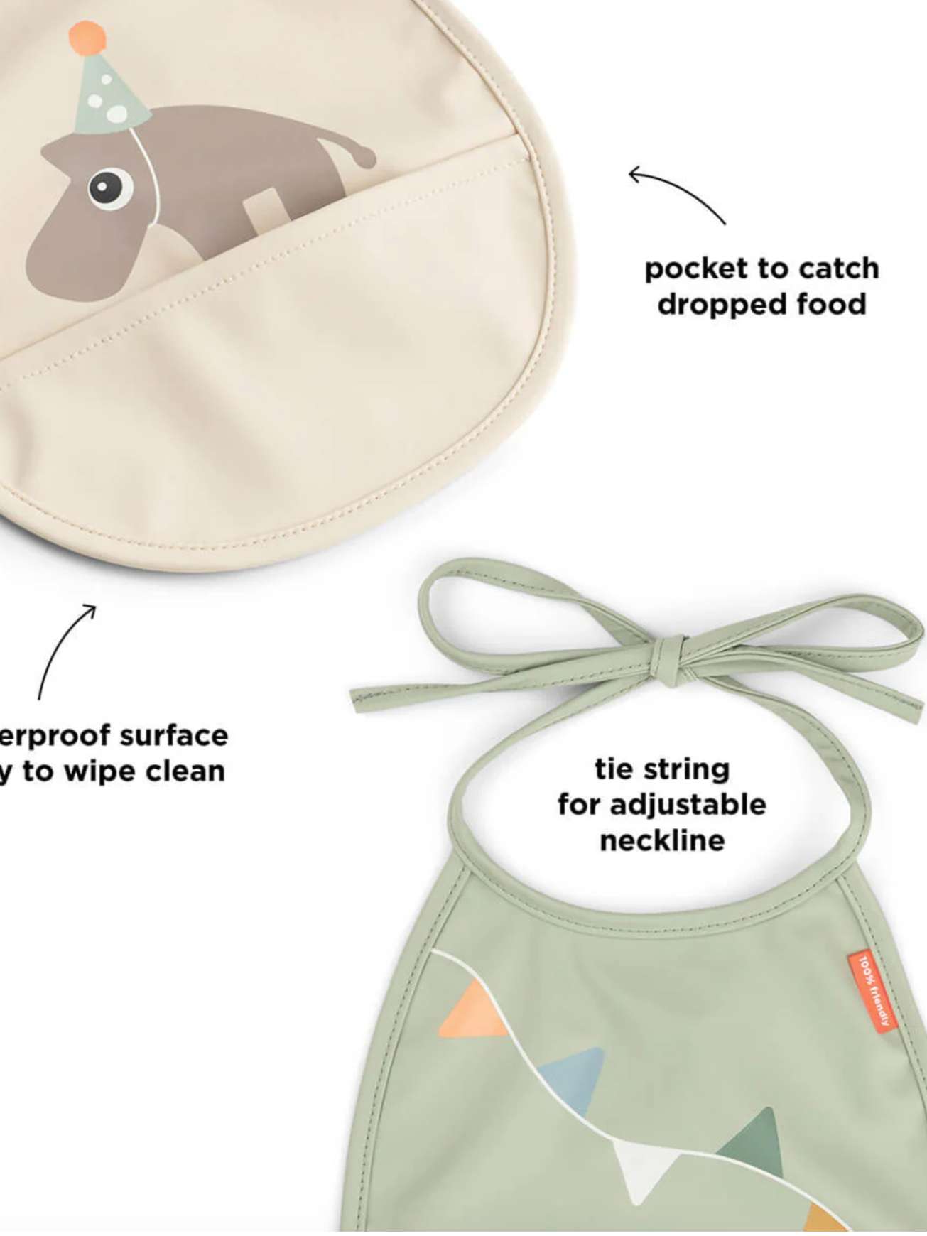 Med en vanntett overflate gir de utmerket beskyttelse for barnets klær og er enkle å tørke av etter måltider. Den innebygde lommen er perfekt for å fange opp mat som faller ned, og bidrar til å minimere søl ved måltidene. Den praktiske snorlukkingen sikrer enkel og justerbar påkledning for den lille. Gjør måltidet morsommere med disse søte og praktiske smekkene.