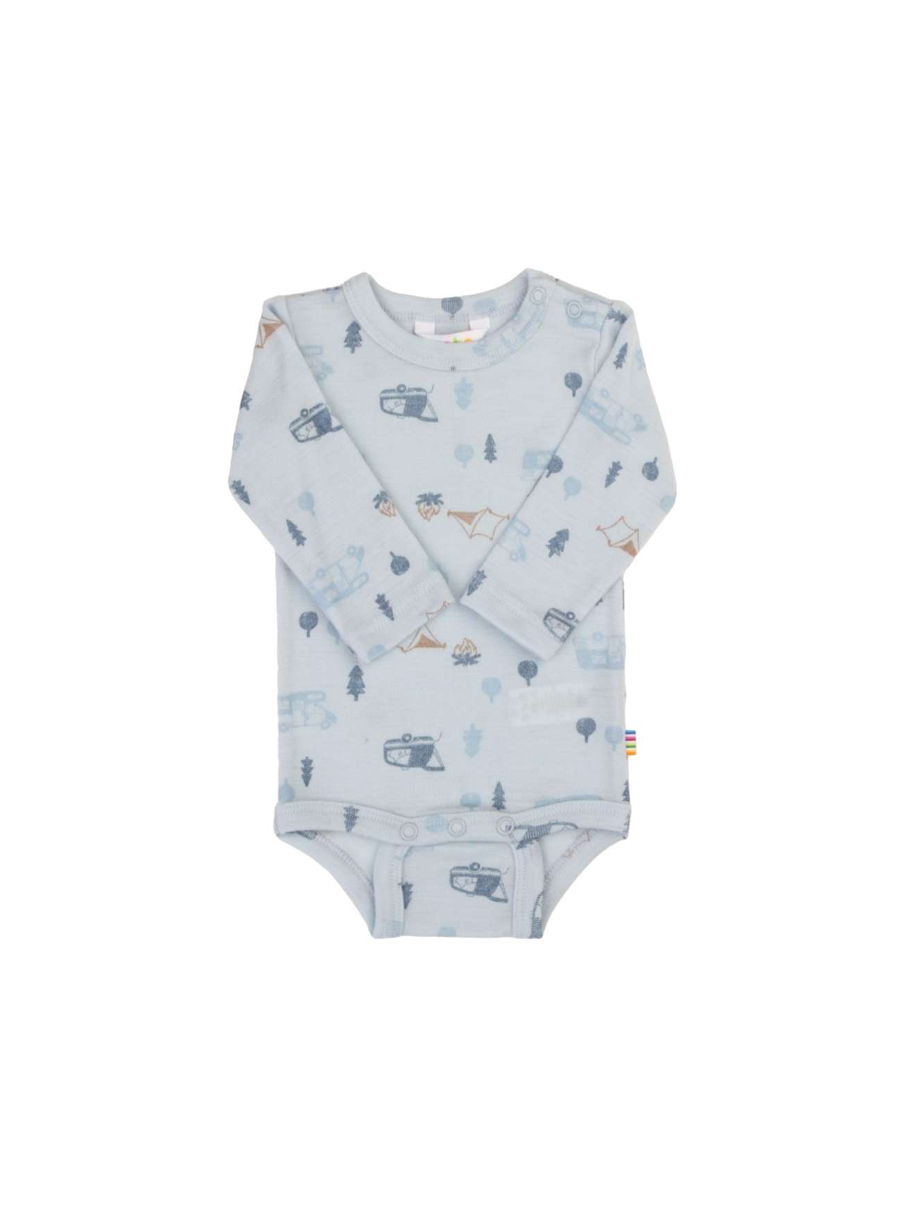 Det er trykknapper på den ene skulderen og mellom bena, for å enkelt kunne kle av og på og under bleieskift.