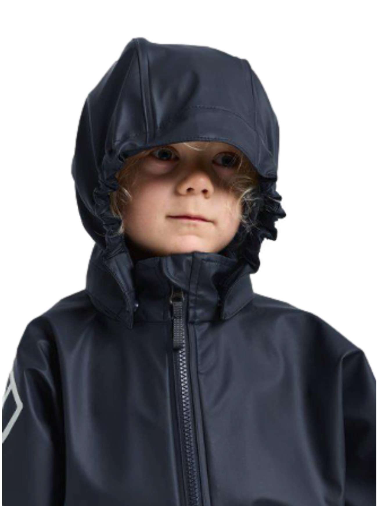 Regnjakken har avtakbar hette med trykknapper, hakebeskyttelse og synlige refleksdetaljer på rygg og mansjetter. Den myke fleeceforede kragen gir ekstra komfort på kjølige og våte dager. Justerbare ermeender sikrer god passform og hindrer vann i å trenge inn.