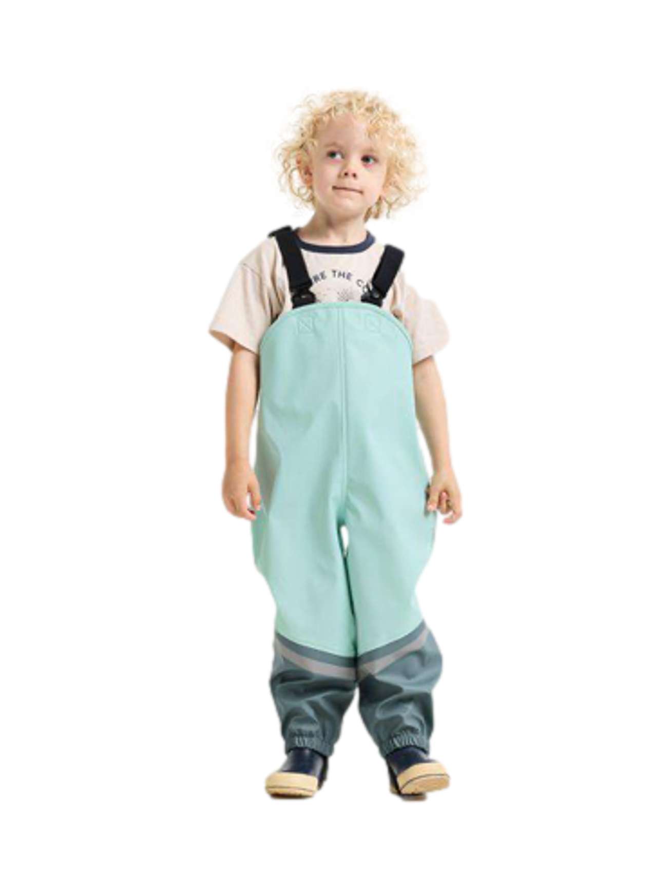 Buksen har høy midje for ekstra beskyttelse, med justerbare og faste seler som holder den godt på plass. Midjen kan tilpasses for optimal komfort. Elastiske benavslutninger og reflekterende detaljer gir både beskyttelse og synlighet. De justerbare og utskiftbare fotstroppene i silikon sørger for at buksen sitter der den skal – selv under aktiv lek.