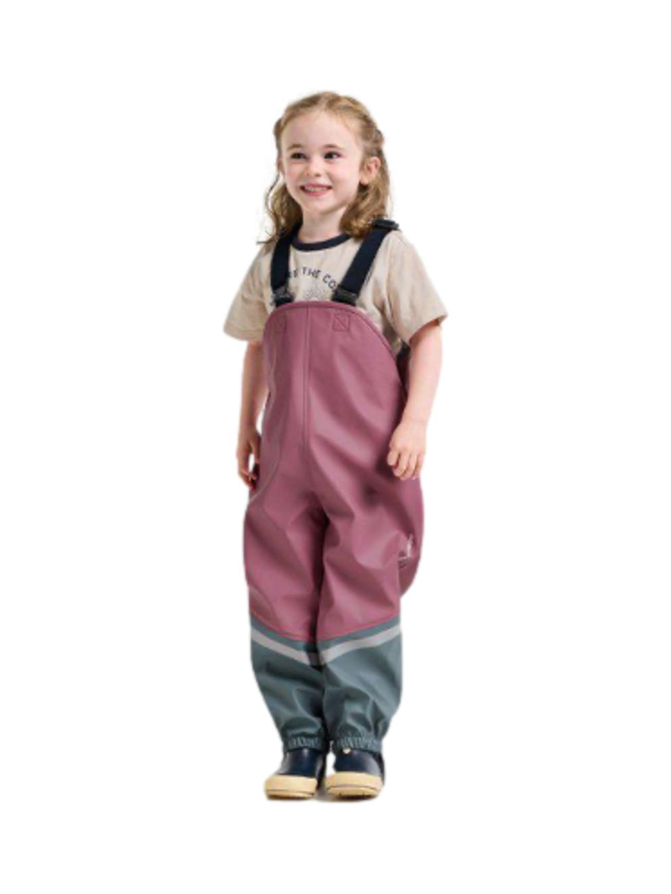 Buksen har høy midje for ekstra beskyttelse, med justerbare og faste seler som holder den godt på plass. Midjen kan tilpasses for optimal komfort. Elastiske benavslutninger og reflekterende detaljer gir både beskyttelse og synlighet. De justerbare og utskiftbare fotstroppene i silikon sørger for at buksen sitter der den skal – selv under aktiv lek.
