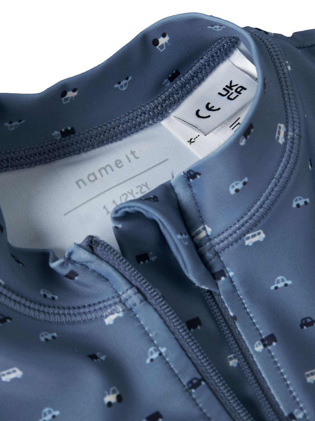 Den stretchy kvaliteten sitter godt på kroppen, mens glidelås gjør av- og påkledning enkelt. Materialet gir effektiv beskyttelse mot solens stråler, slik at barnet kan leke trygt utendørs.