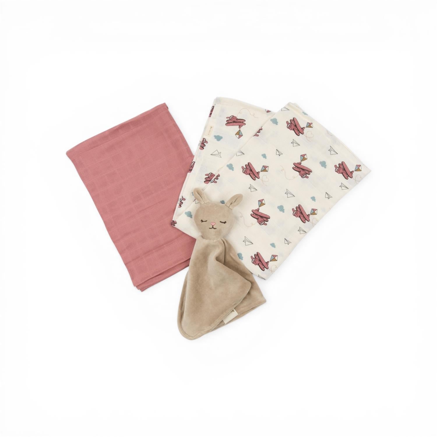 Settet inneholder både musselinkluter til hverdagsbruk og en myk koseklut som raskt blir en trygg følgesvenn til både søvn og lek.