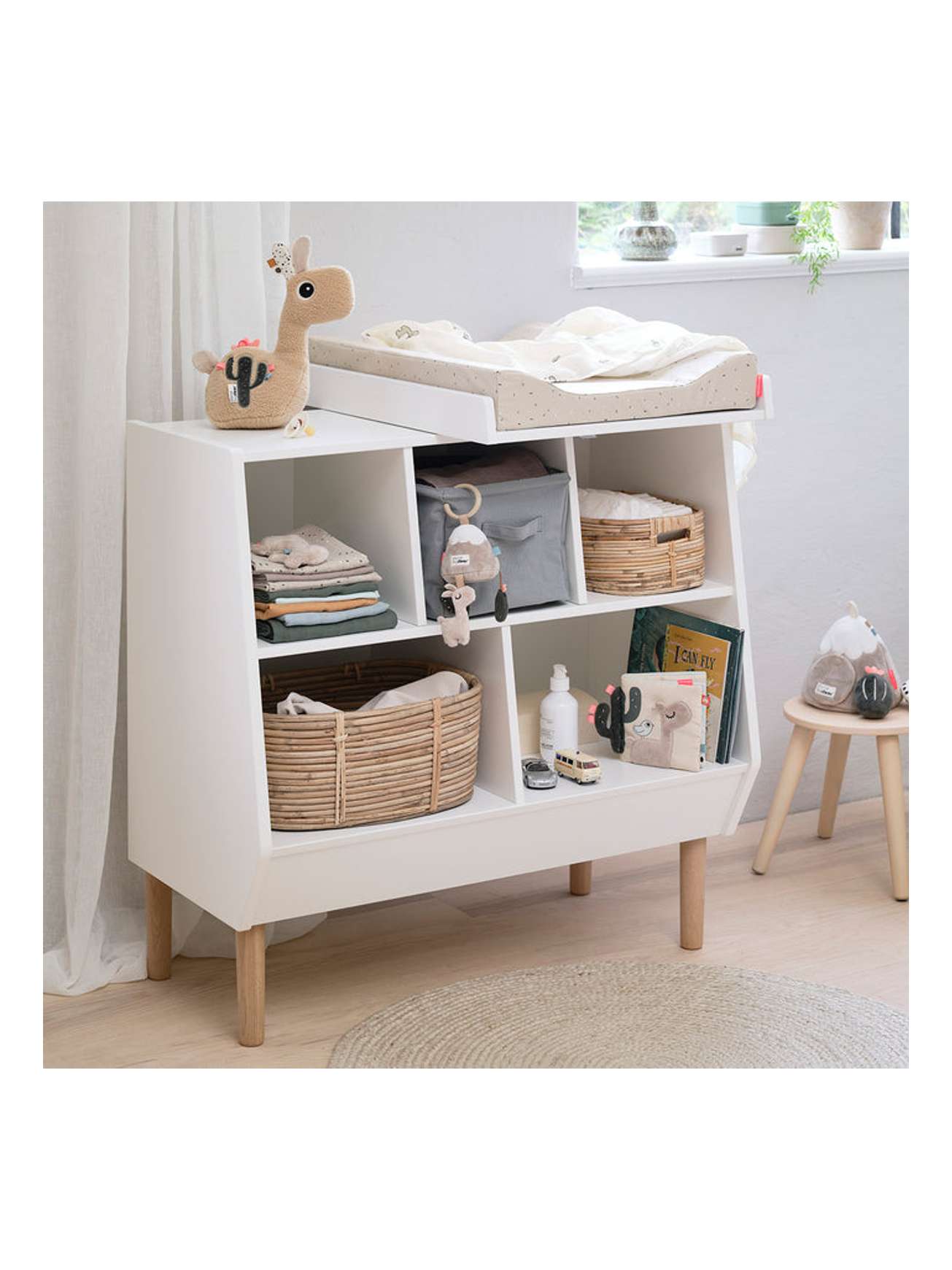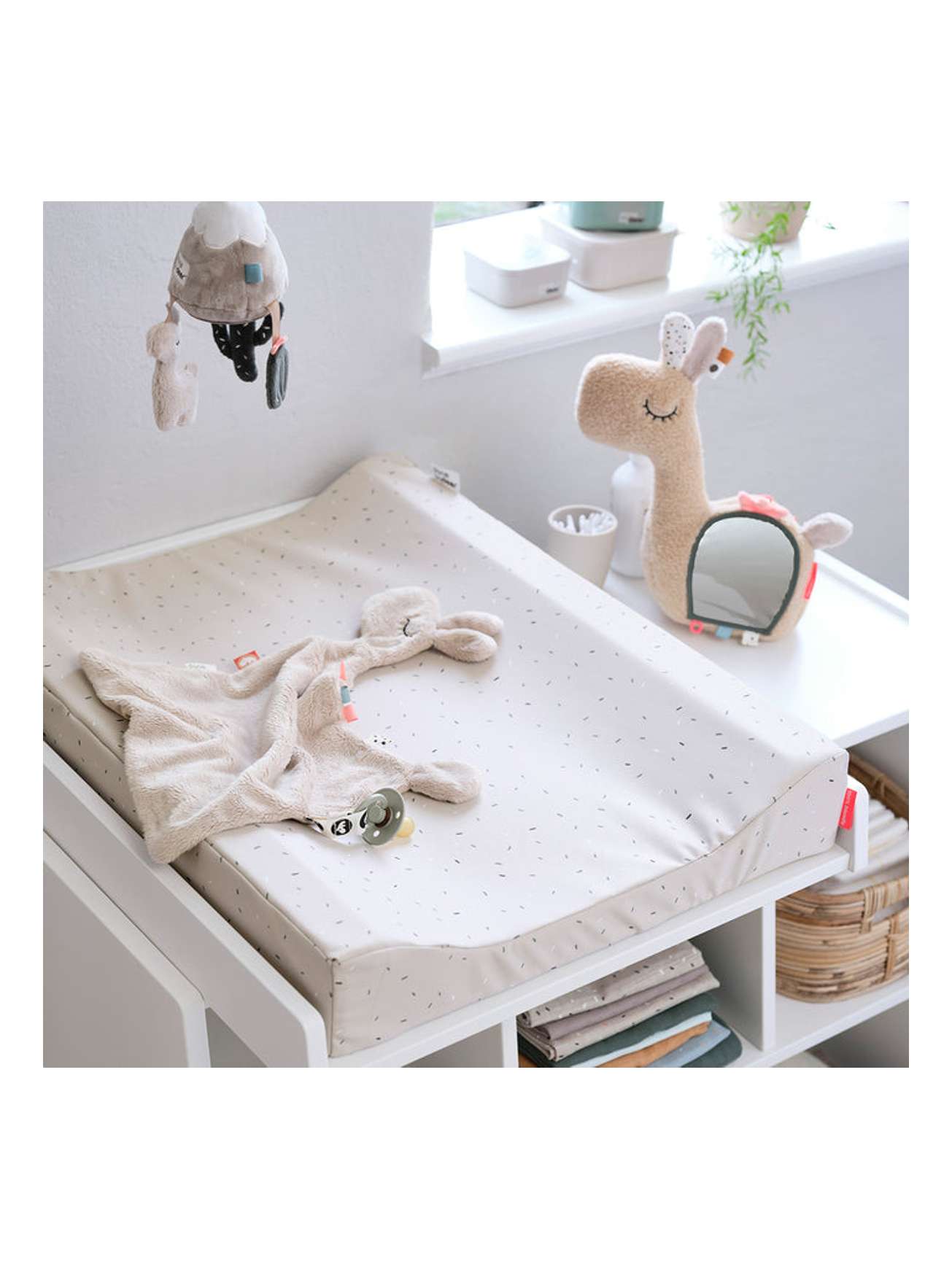 Trekket tas enkelt av med glidelås og kan vaskes i vaskemaskin. En funksjonell og søt stellepute i sand med et søtt konfettitrykk for å holde babyen din med selskap når du skifter tid.